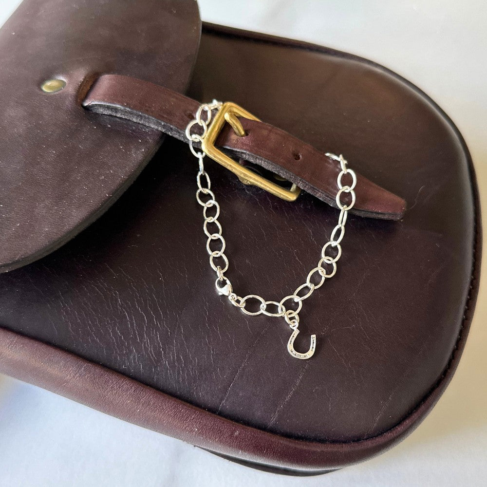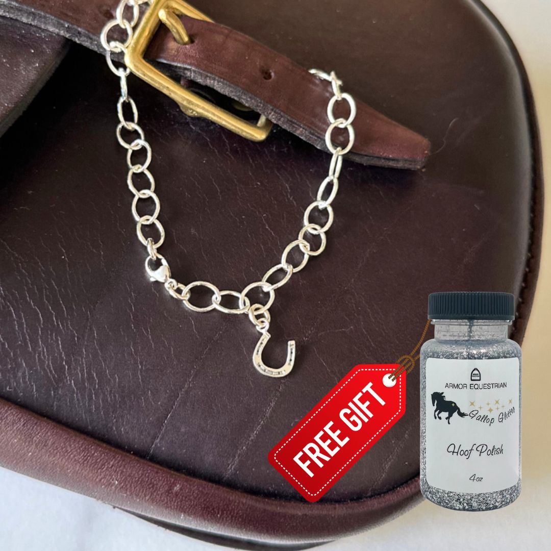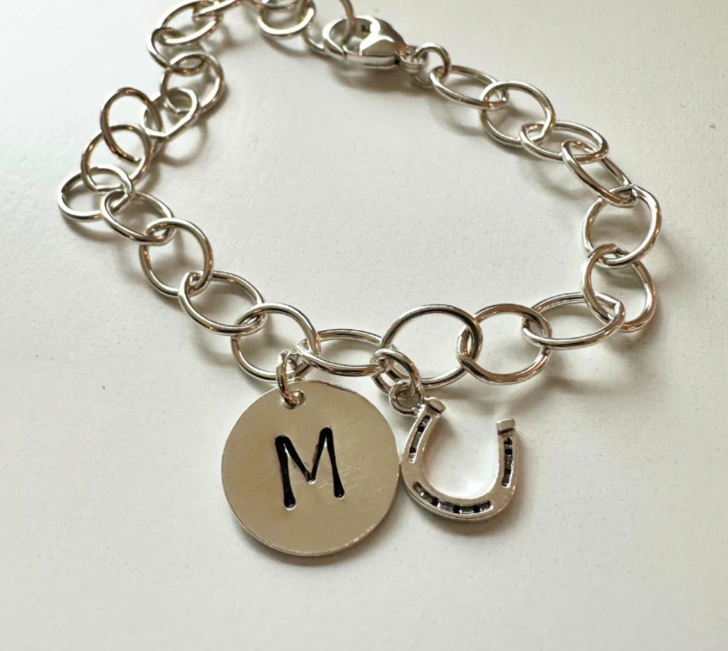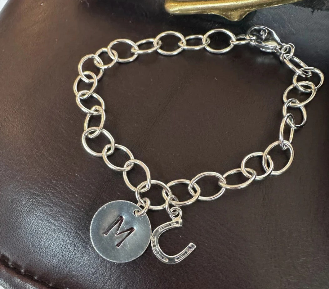 Our Sterling Silver Initial Horseshoe Charm Bracelet lets your bring your love of horses with you everywhere you go! This sterling bangle is lightweight and comfortable, making perfect for everyday wear.