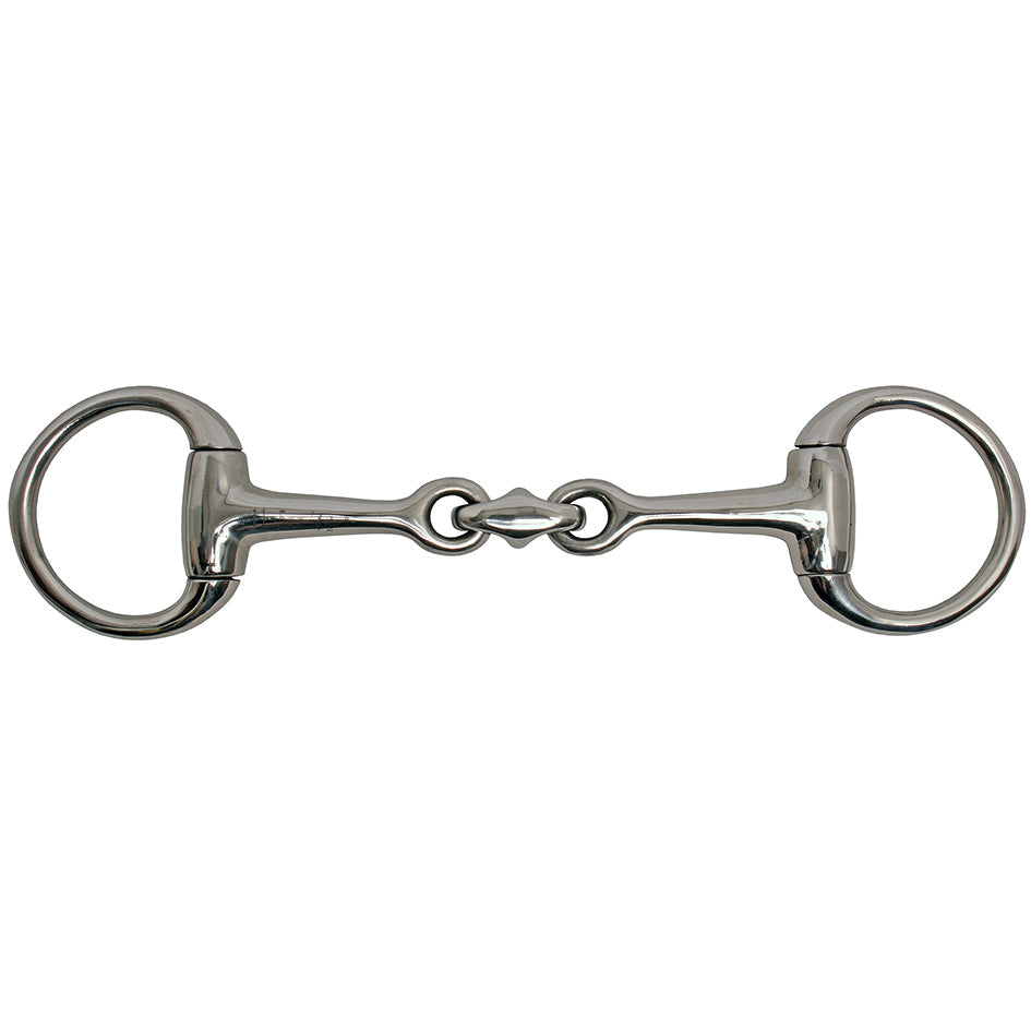Eggbutt Jointed Lozenge bit is a mild action which helps the bit follow the mouth conformation, a kind bit for everyday use. The lozenge (also called a peanut) refers to the oval piece which sits in the centre of the mouthpiece, joining the two halves of the bit together.