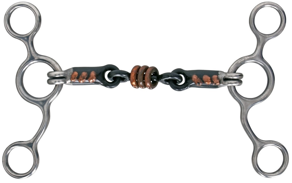 Three piece sweet iron mouth with copper ribs and rollers. Very effective and humane.