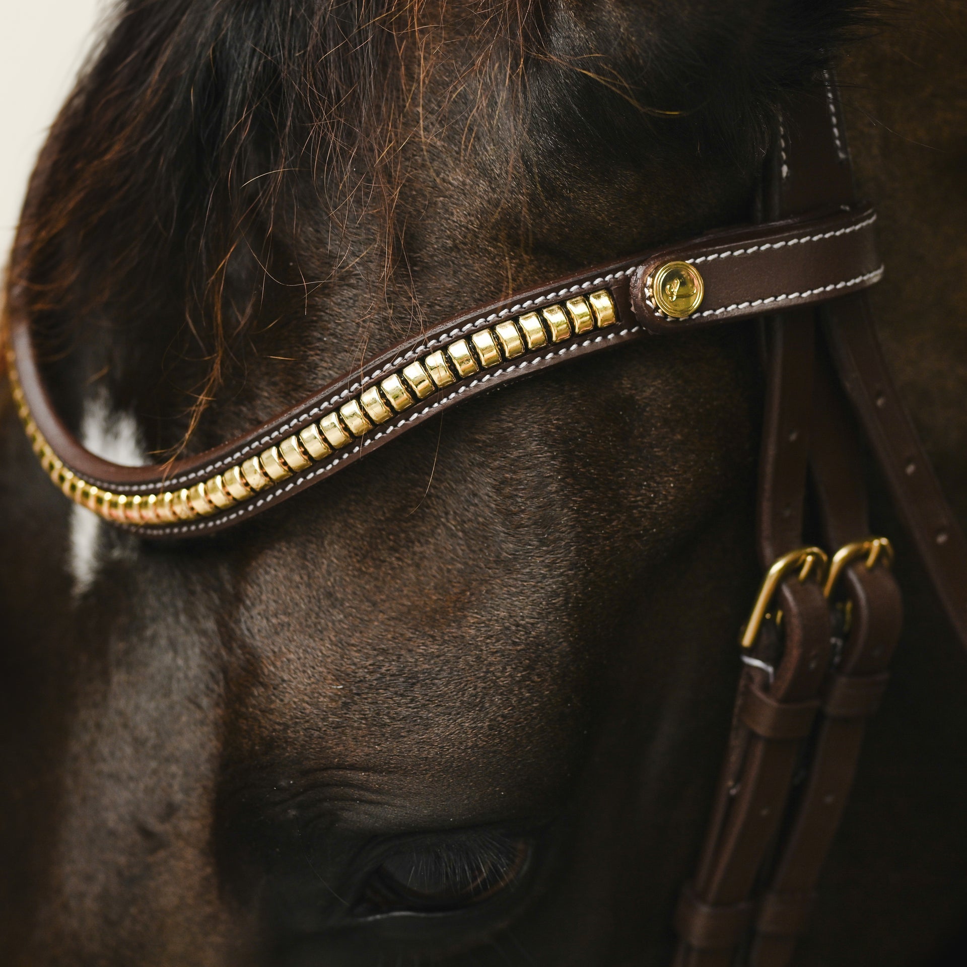The brass clincher browband is elegantly curved, and is one of the first to feature our new easy-change button system. The premium satin finish brass button means you can switch the browband over in seconds.