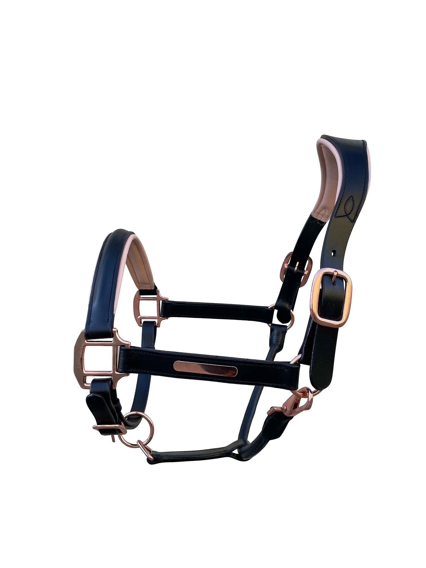 The halter is adorned with premium rose gold fittings and a personalised nameplate, adding a touch of glamour that glimmers in the sunlight.Β