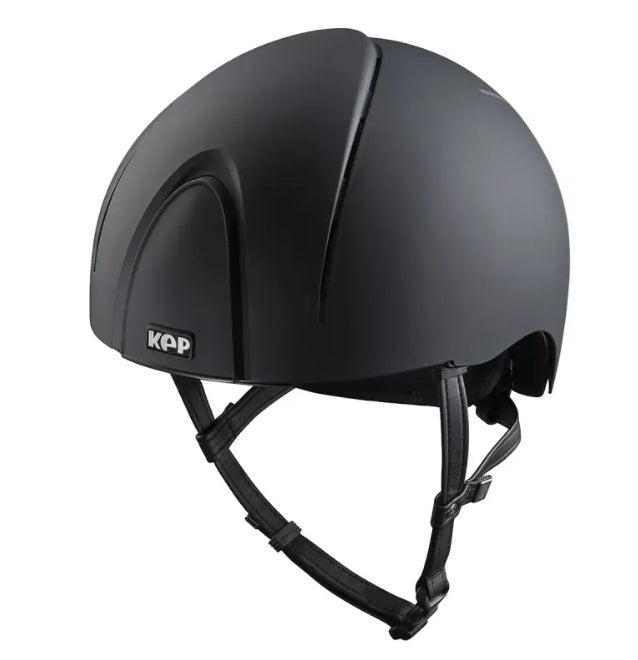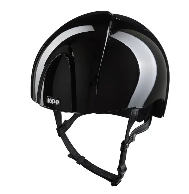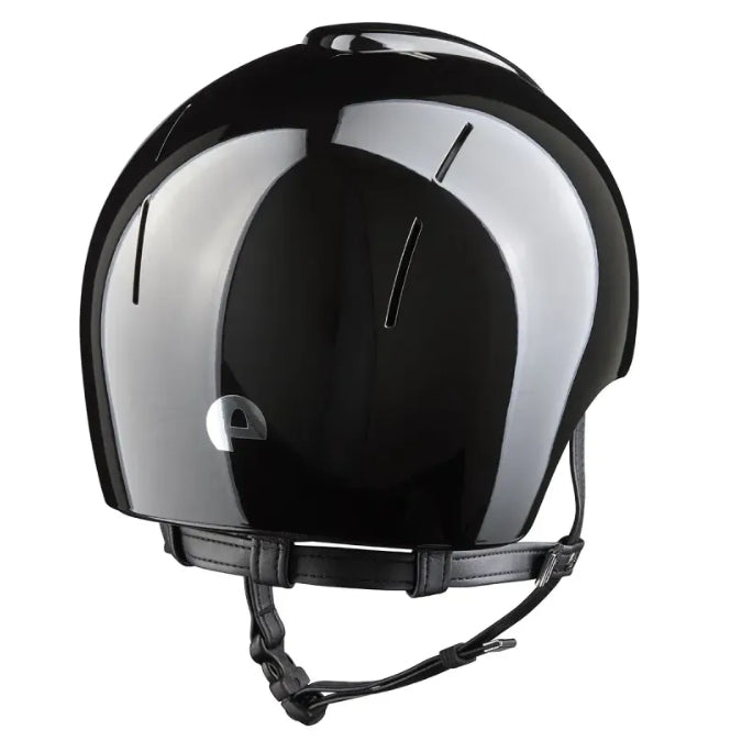 Riding helmet with painted ABS outer shell and EPS inner layer offering high impact resistance. The extended rear design follows the ergonomic shape of the nape of the neck, protecting one of the most delicate areas without restricting movement. The faux leather chin strap, equipped with a 5-point fastening system, ensures maximum stability.