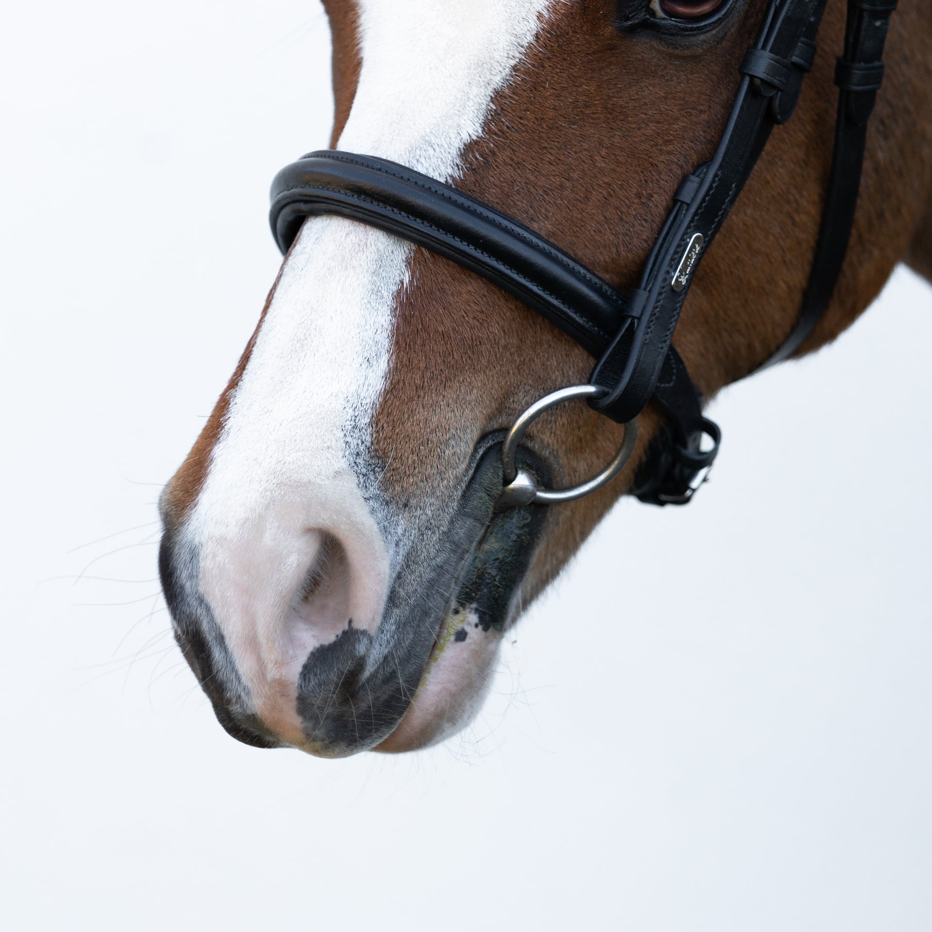 The 'Megan' is a classic matte leatherΒ pony bridleΒ with a more delicate convertible noseband, to suit ponies with finer faces. It features a stunning two-toned champagne and gold browband that suits a pony of any colouring.