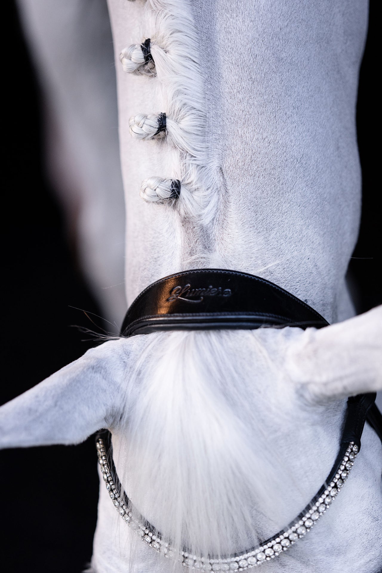 This browband features a supple black or brown Italian leather band,Β handcrafted from Austrian stellux crystals.