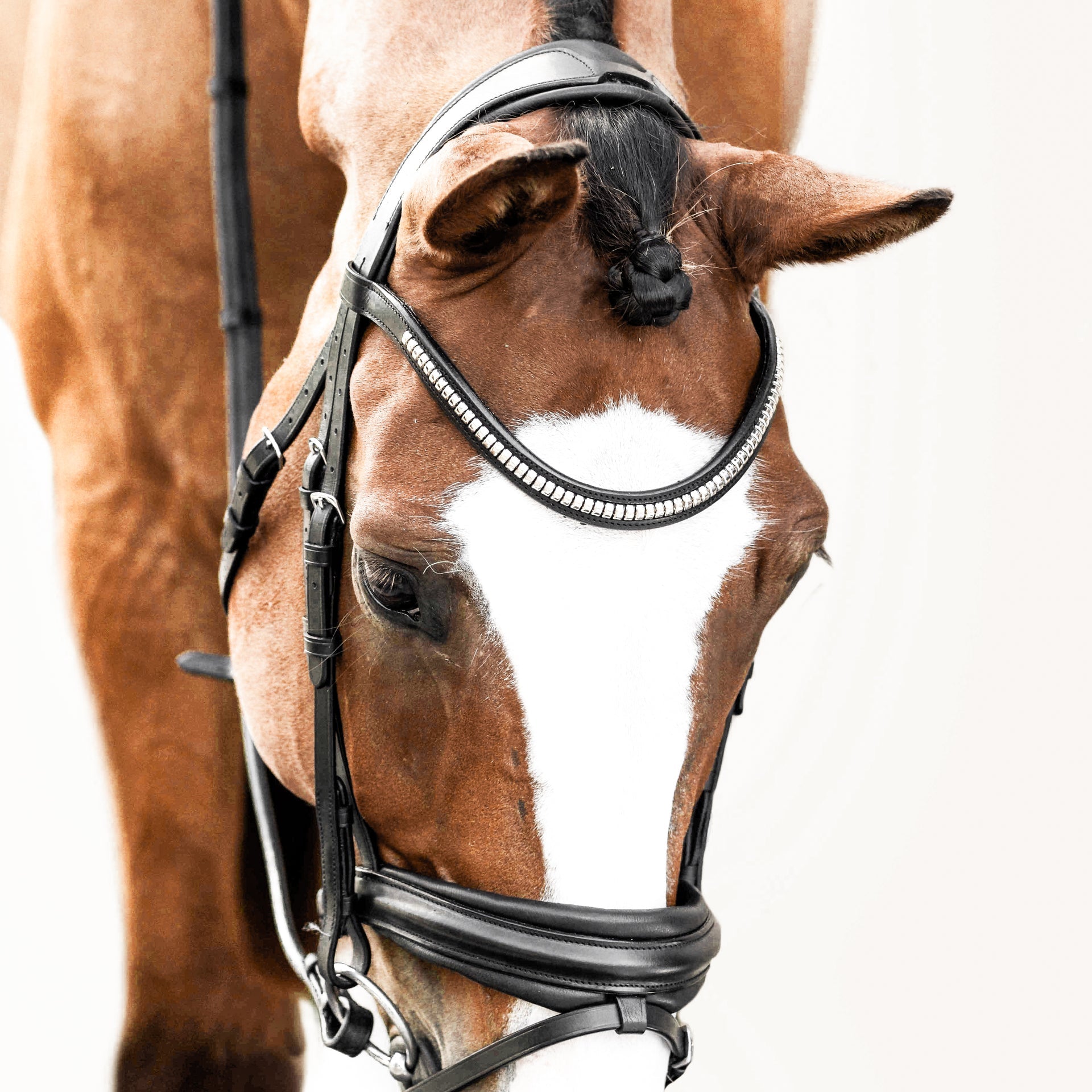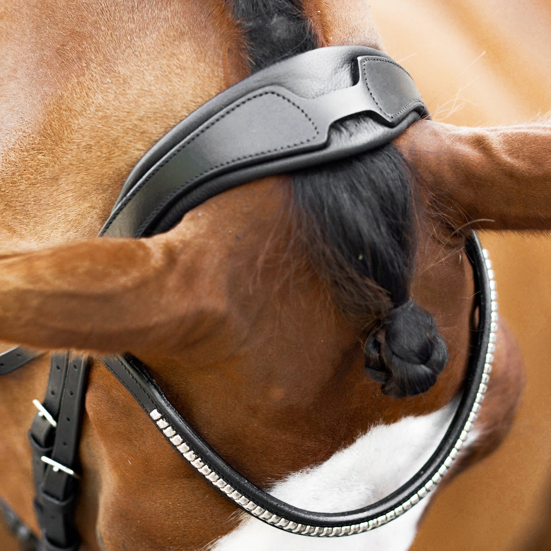 The headpiece is soft nappa leather with gel padding, cut away from the ears, that moulds to the horse's head for the ultimate comfort. It is a 'monocrown' headpiece which means it is a single strap over the poll which removes pressure points or pinching.