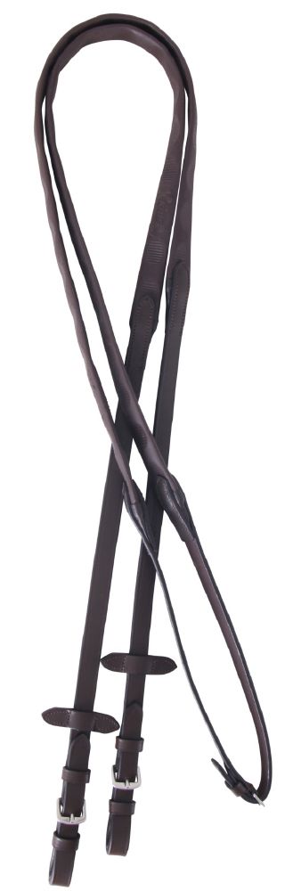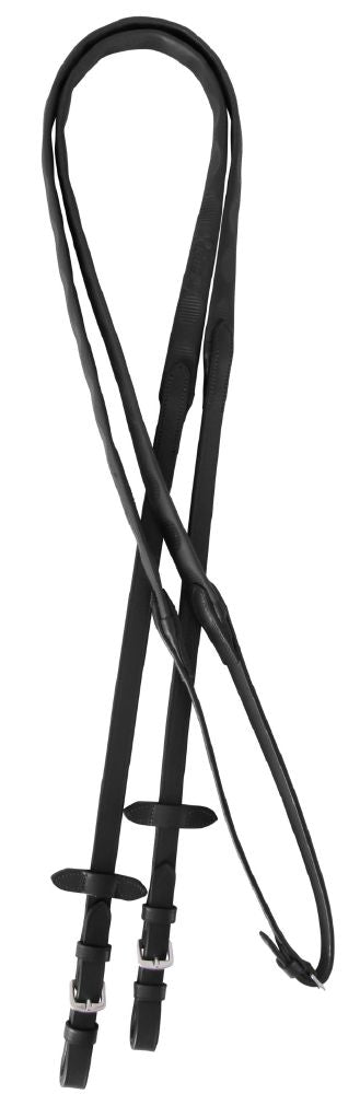These reins feature a finger-contoured rubber grip, offering enhanced comfort and control.