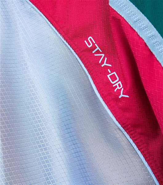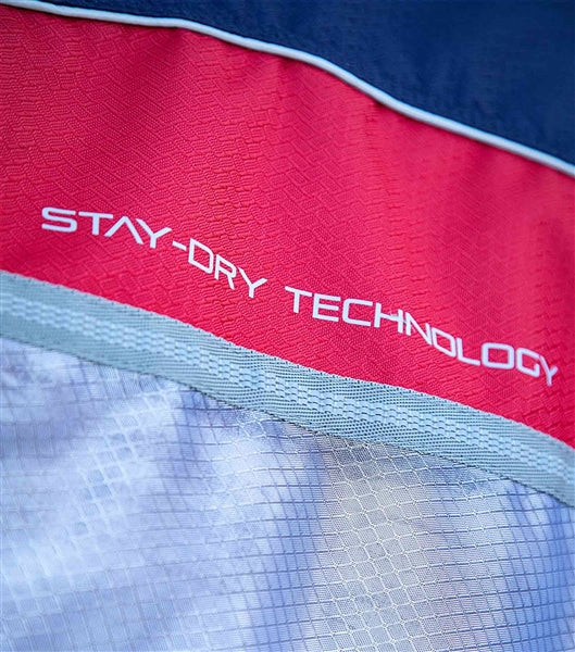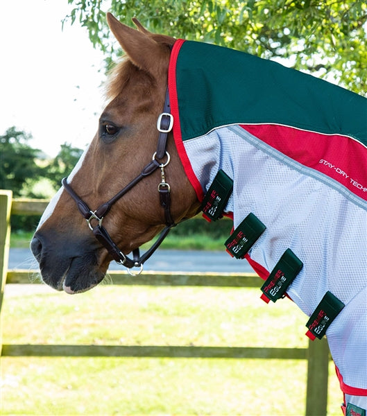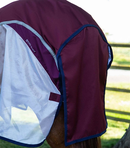 The Stay-Dry Super Lite Fly Rug combines contemporary styling with revolutionary super lightweight material. The upper section is made from a 600D ripstop waterproof and breathable material providing protection from rain showers. The lower section is made from 100% lightweight nylon approx. 70% UV reflective which offers incredible strength, durability and superior comfort designed to protect against flies and insects. This rug is the ideal choice for those summer days when the weather can't quite make it's mind up, rain showers one minute and sunshine the next and is perfect for those in-between days. It will help keep your horse dry from the showers whilst helping to prevent heat build up when the sun comes out. The perfect addition to any horse's wardrobe. This technically advanced, unique fly rug is secured using quick-release chest clips and cross surcingles.