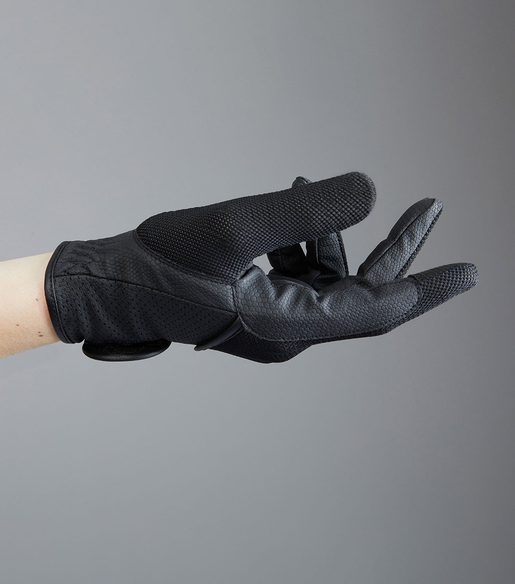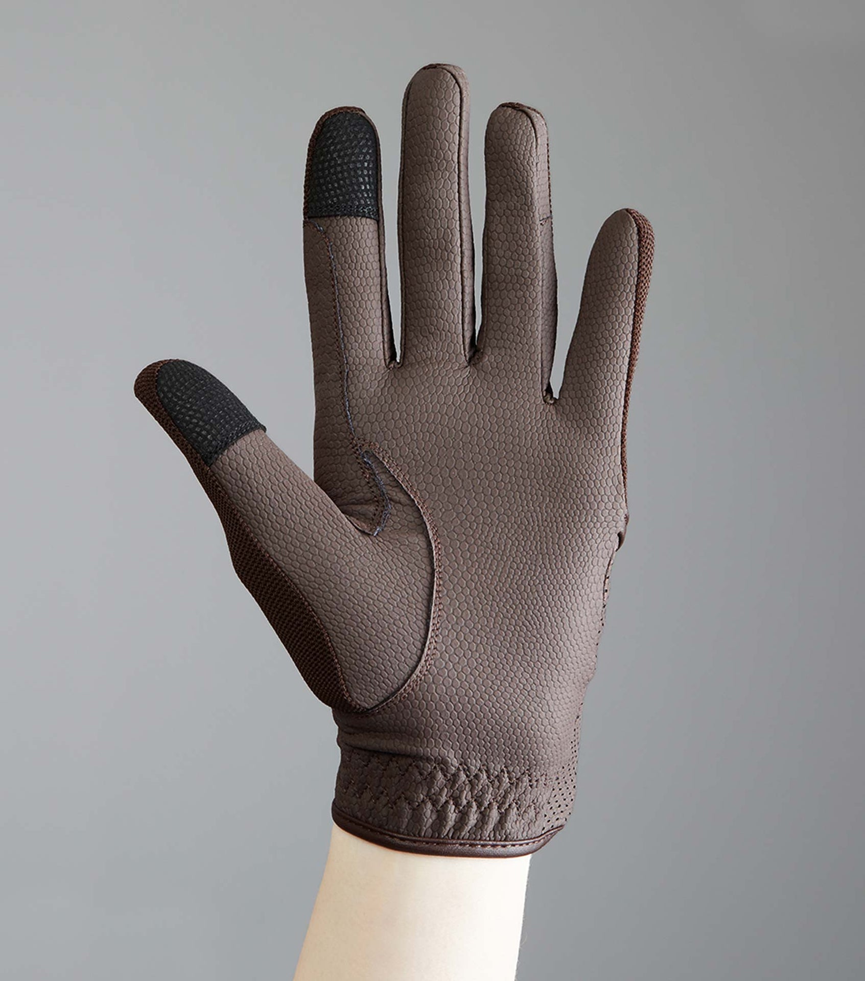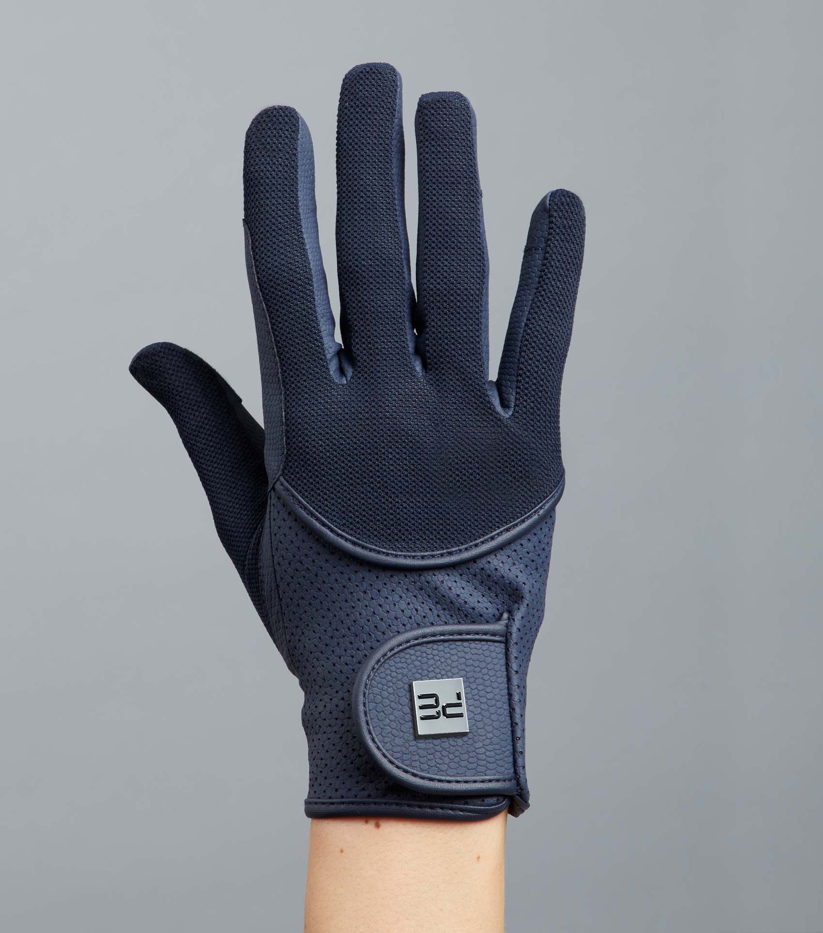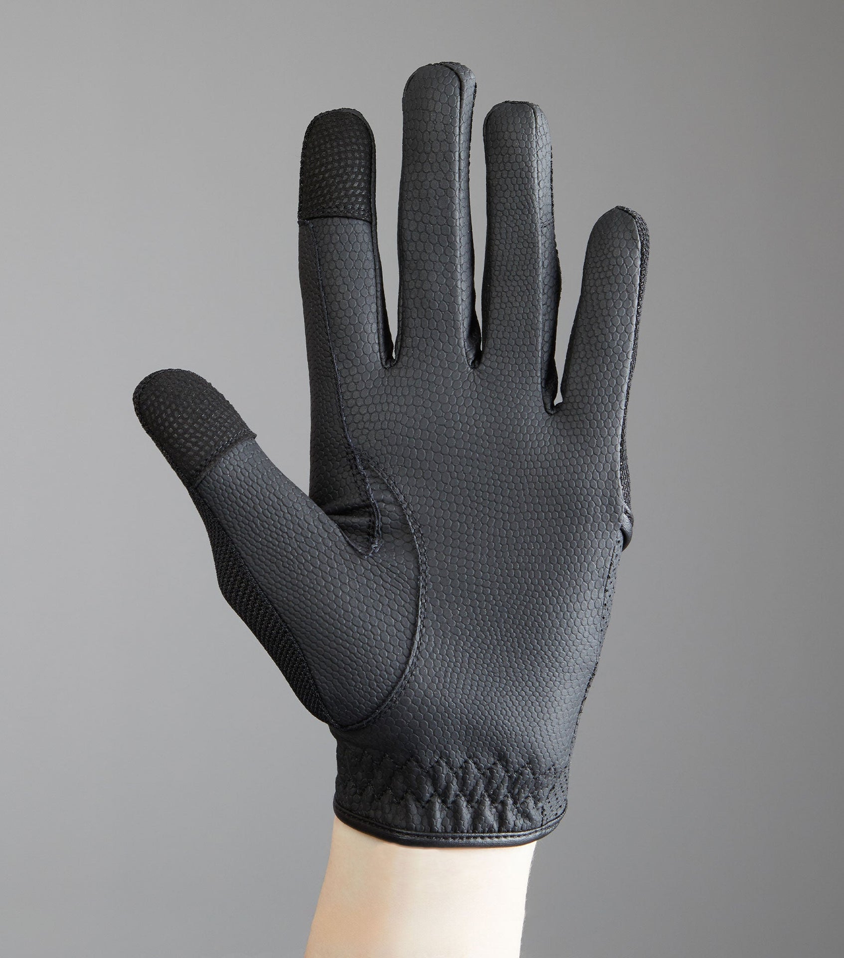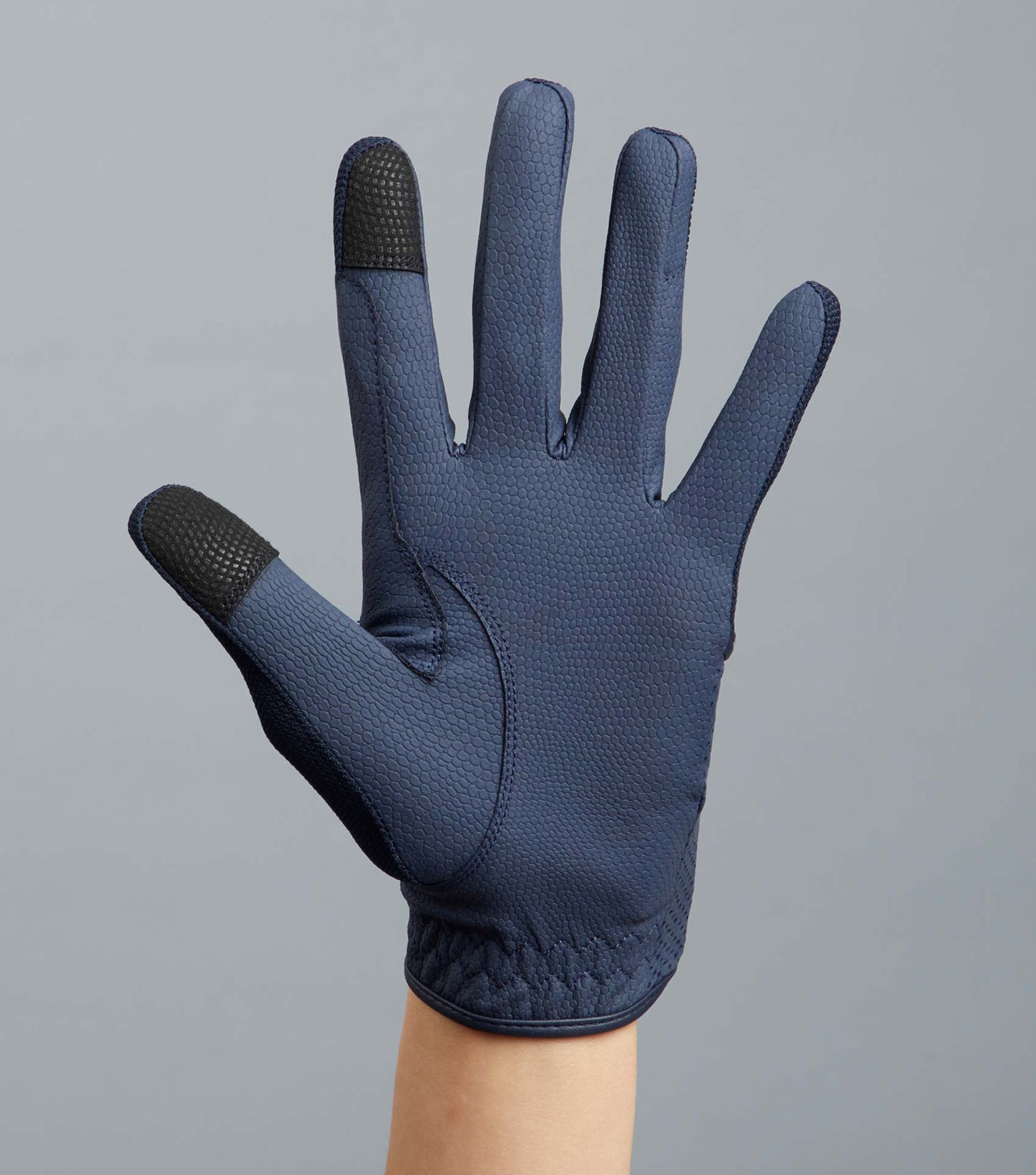 The palm of the glove is made from lightweight synthetic leather, providing optimum grip on the reins. A touch screen panel on the index finger and thumb allows for use of your phone without removing your gloves. Complete with Velcro closure with an elegant PE branded badge, these riding gloves are ideal for your everyday equestrian activities and competition use.