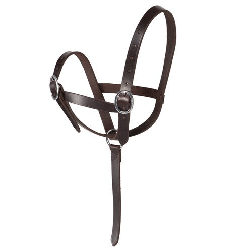 Sturdy leather halter with catching strap attached.