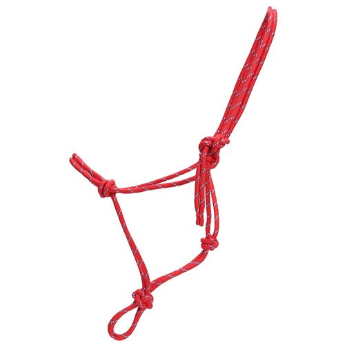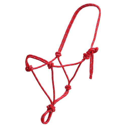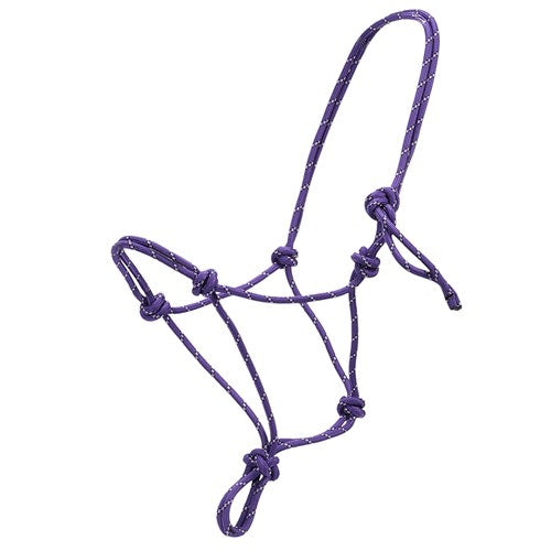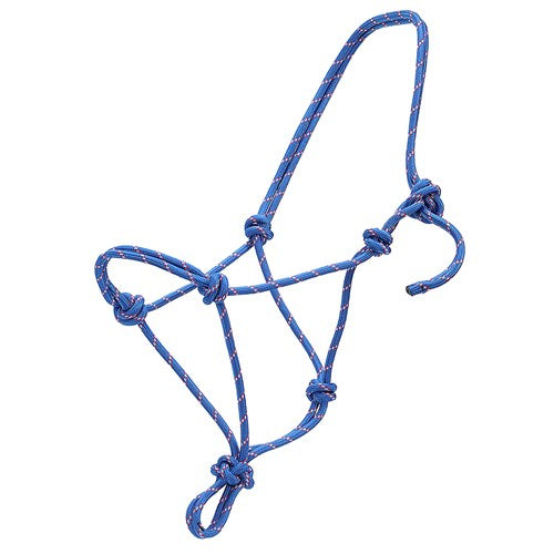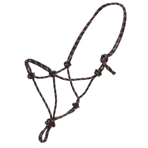 Knotted rope halter made from a continuous length of braided climber's rope.