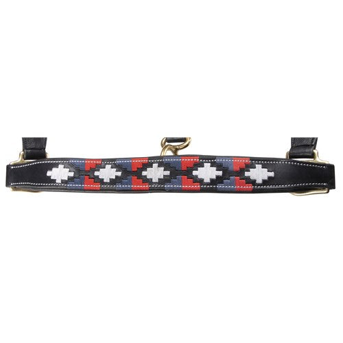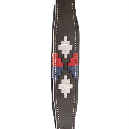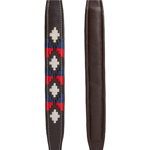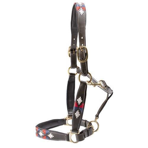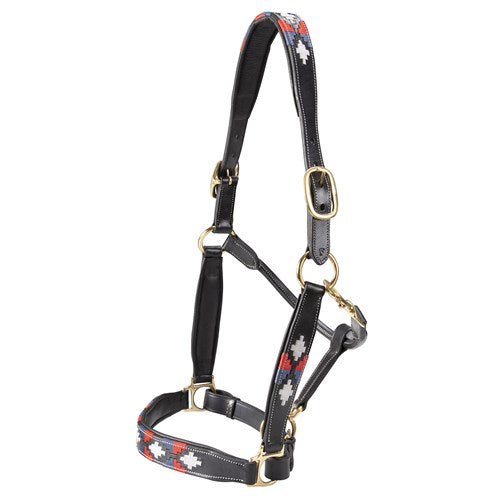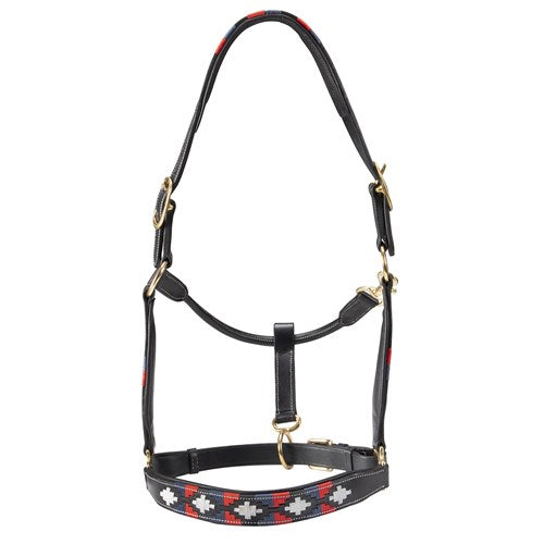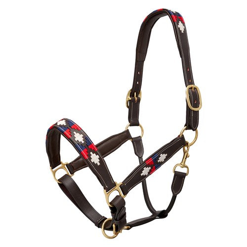 Soft leather halter available in either black or brown leather with red, white and blue polo style pattern.