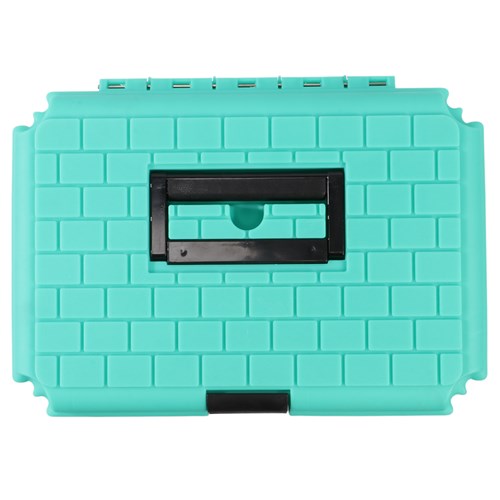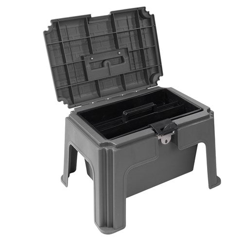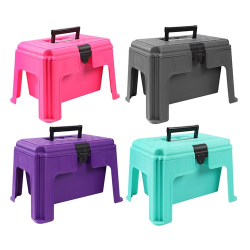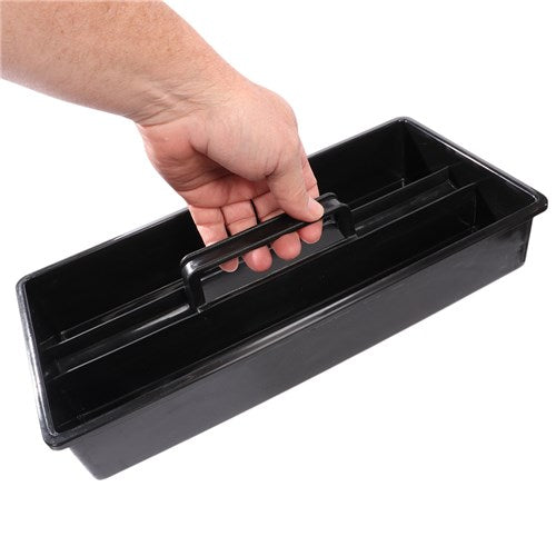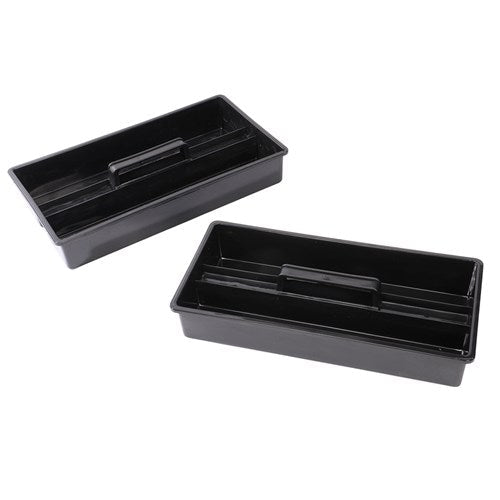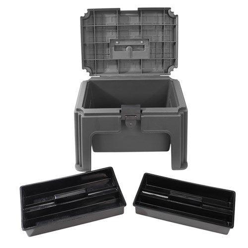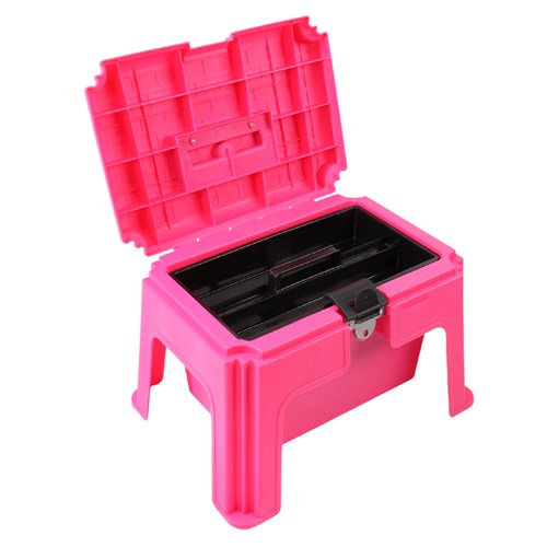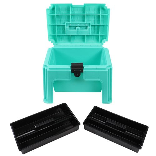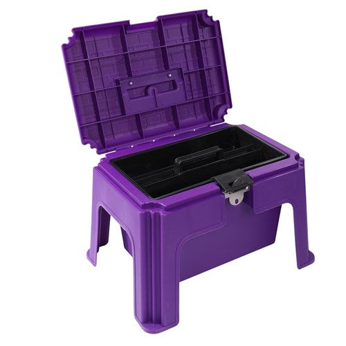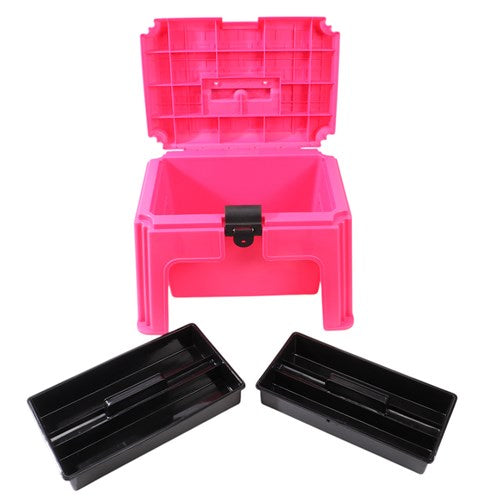 Inside are two separate storage trays, one deep and one shallow for the storage of trimming scissors, braid bands, hoof blackener and brushes.